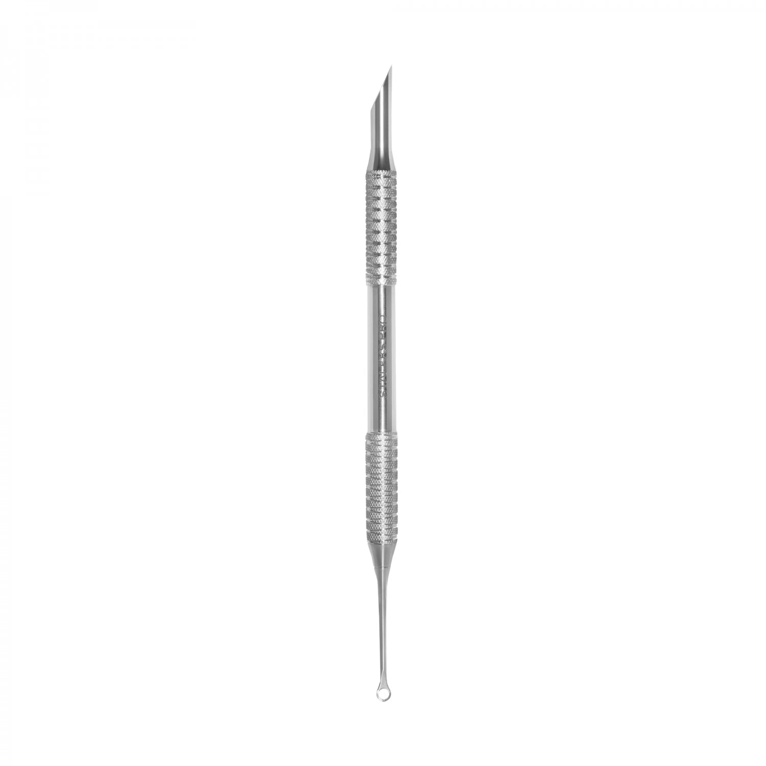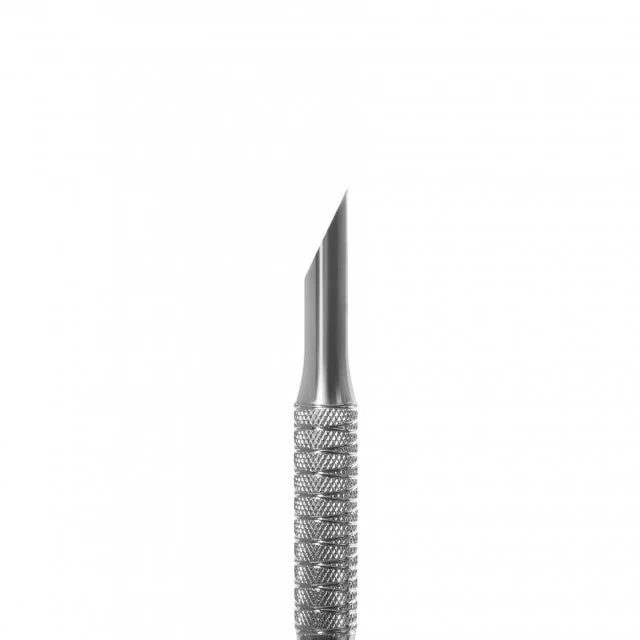 - Mit dem Arbeitsteil „stumpfer Schieber“ wird die raue und stark haftende Nagelhaut angehoben und zurückgeschoben, wodurch der freie Nagelrand freigelegt und die Reste des Gellacks entfernt werden.