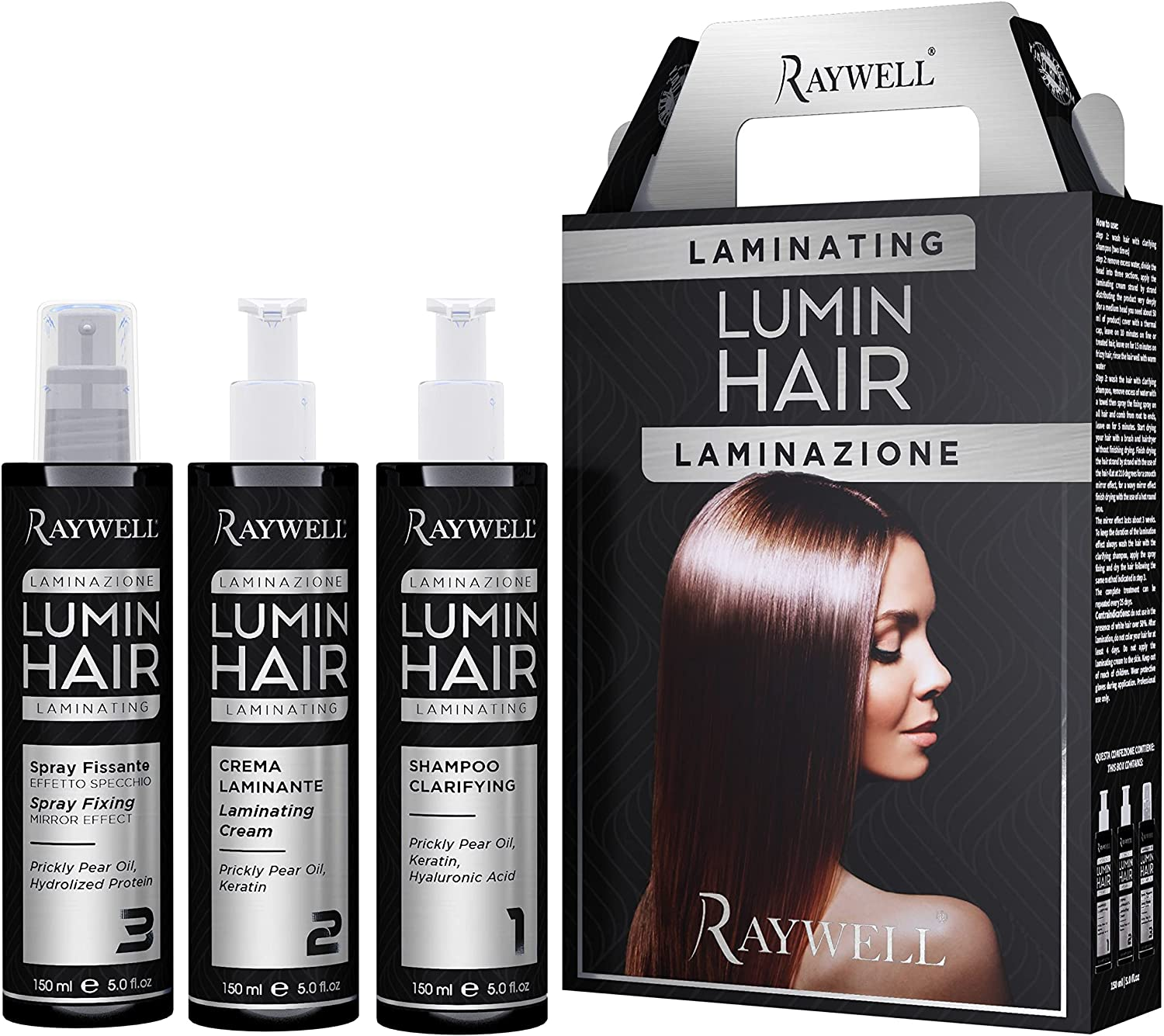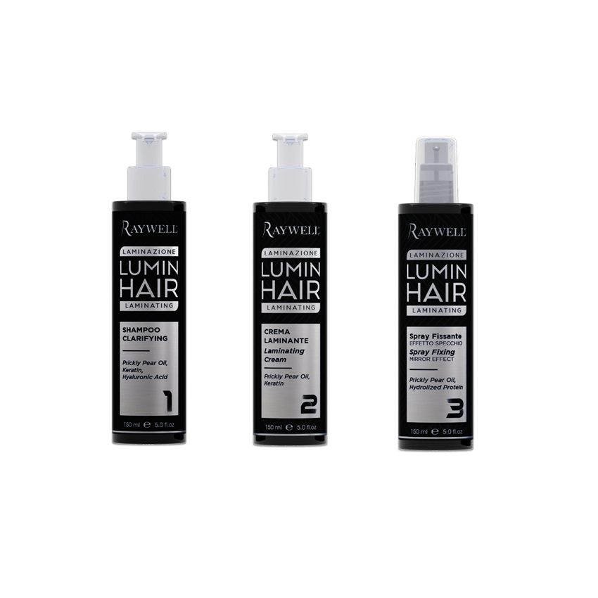 Laminating Lumin Hair Raywell è un trattamento completo termoattivo per capelli che ristruttura, lucida lo stelo donando "l'effetto specchio" e svolge un'efficace azione anticrespo. I tre prodotti sono formulati con olio vegetale di fico d’India, ricco di acidi grassi, omega 6, vitamina E ed antiossidanti che rigenera la fibra capillare, arricchiti da cheratina idrolizzata e acido ialuronico che avvolgono il capello con un film riflettente ed anticrespo.